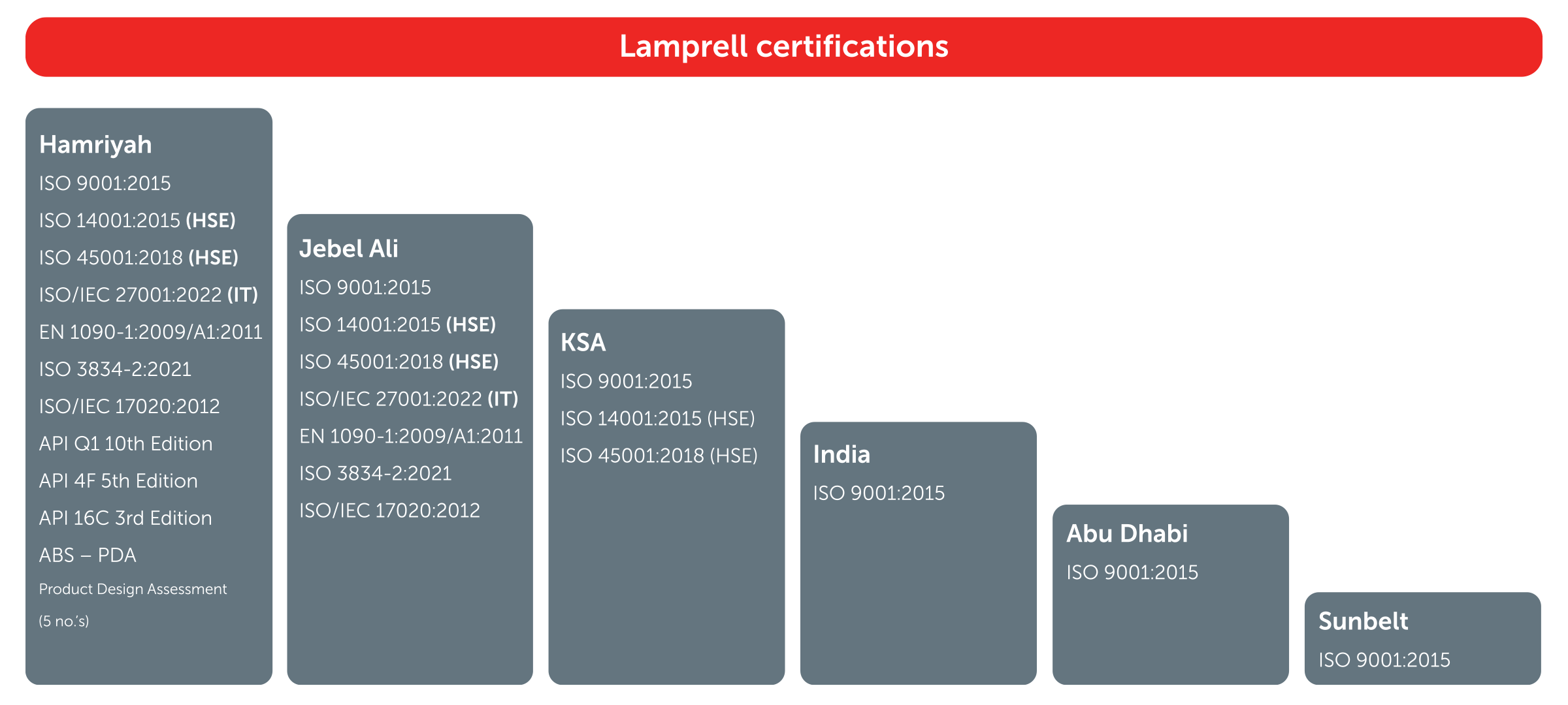 Our Lamprell Group Management System (LGMS) meets globally recognized standards such as ISO 9001:2015, API Q1, EN 1090, ISO 3834, and ISO/IEC 17020, with API Monogram licenses for Spec 4F & 16C empowers us to drive customer success, regulatory compliance, and sustainability across the value chain. We proactively expand certifications to meet project-specific compliance needs, ensuring agility for offshore, marine, and renewable energy projects.